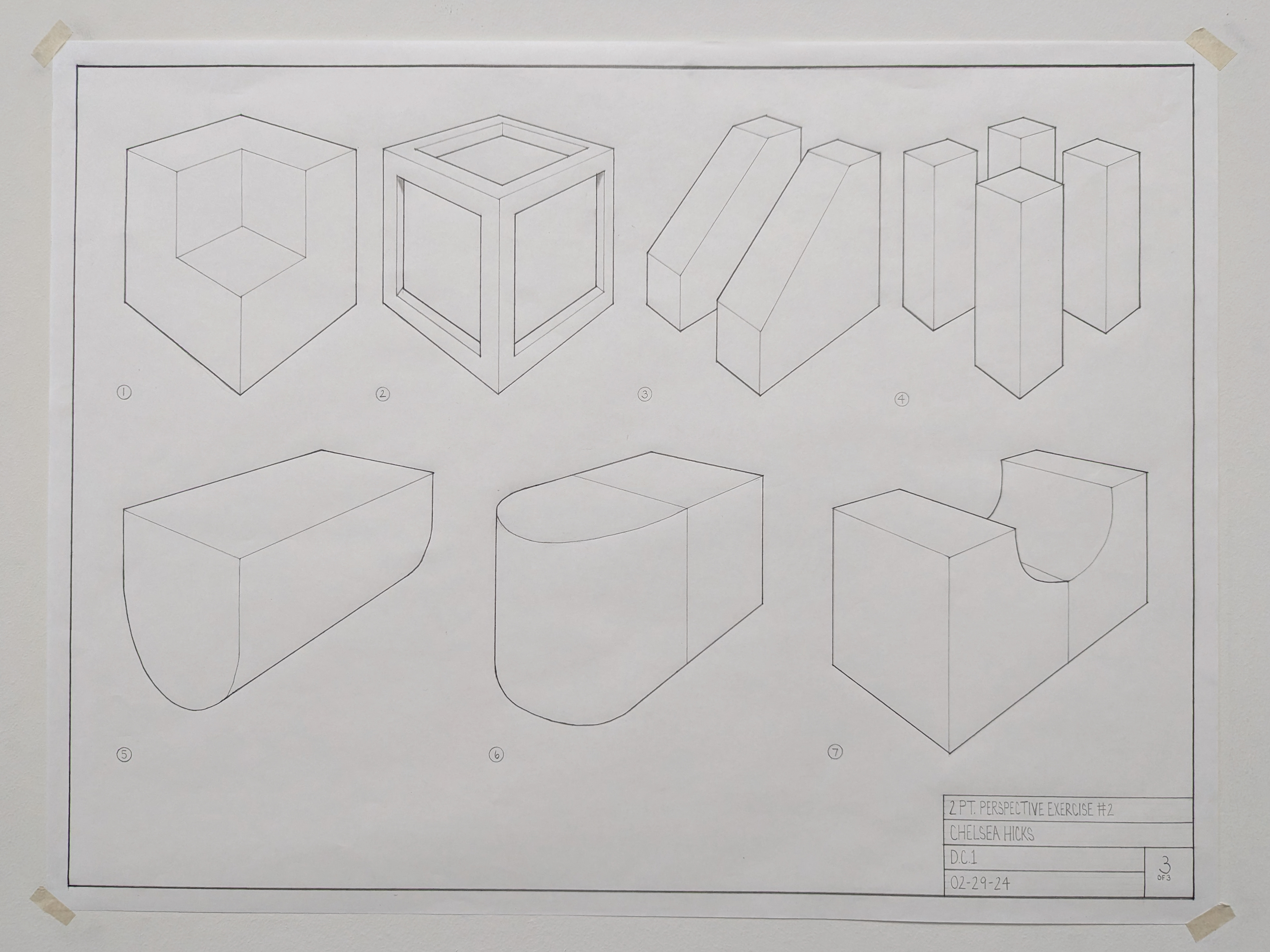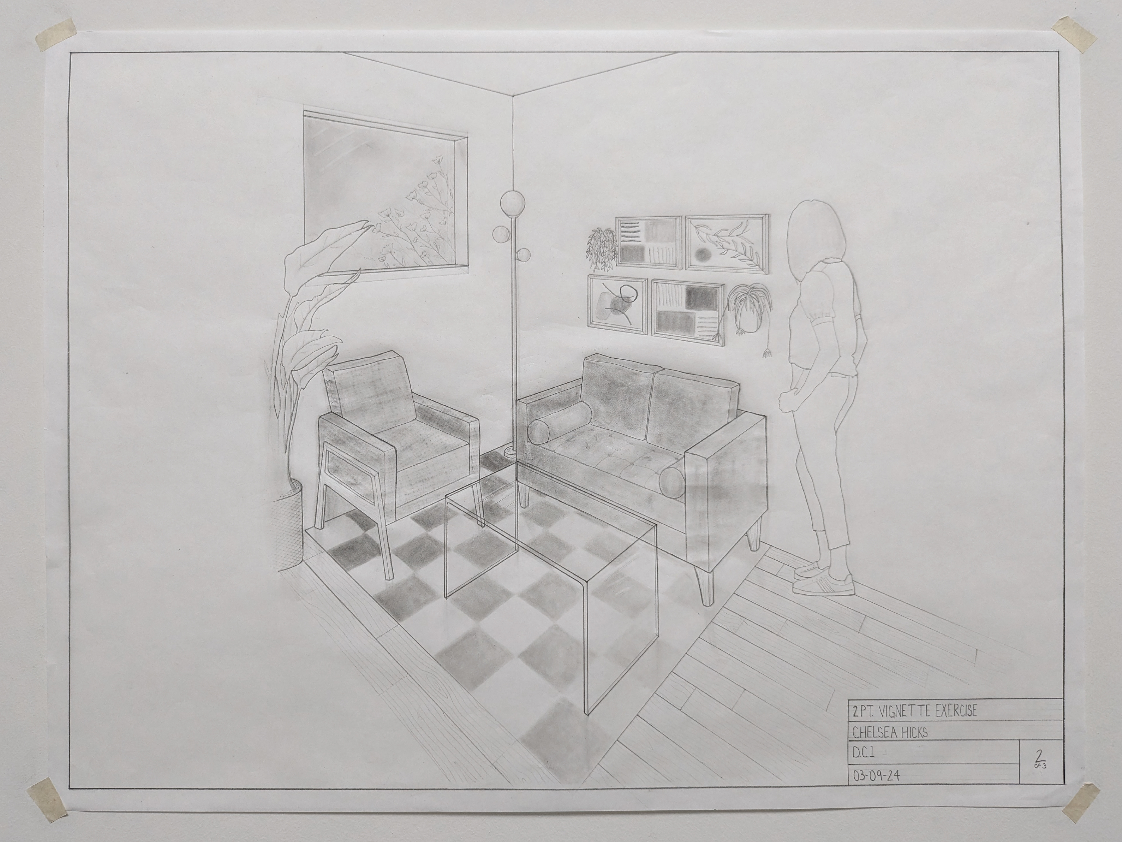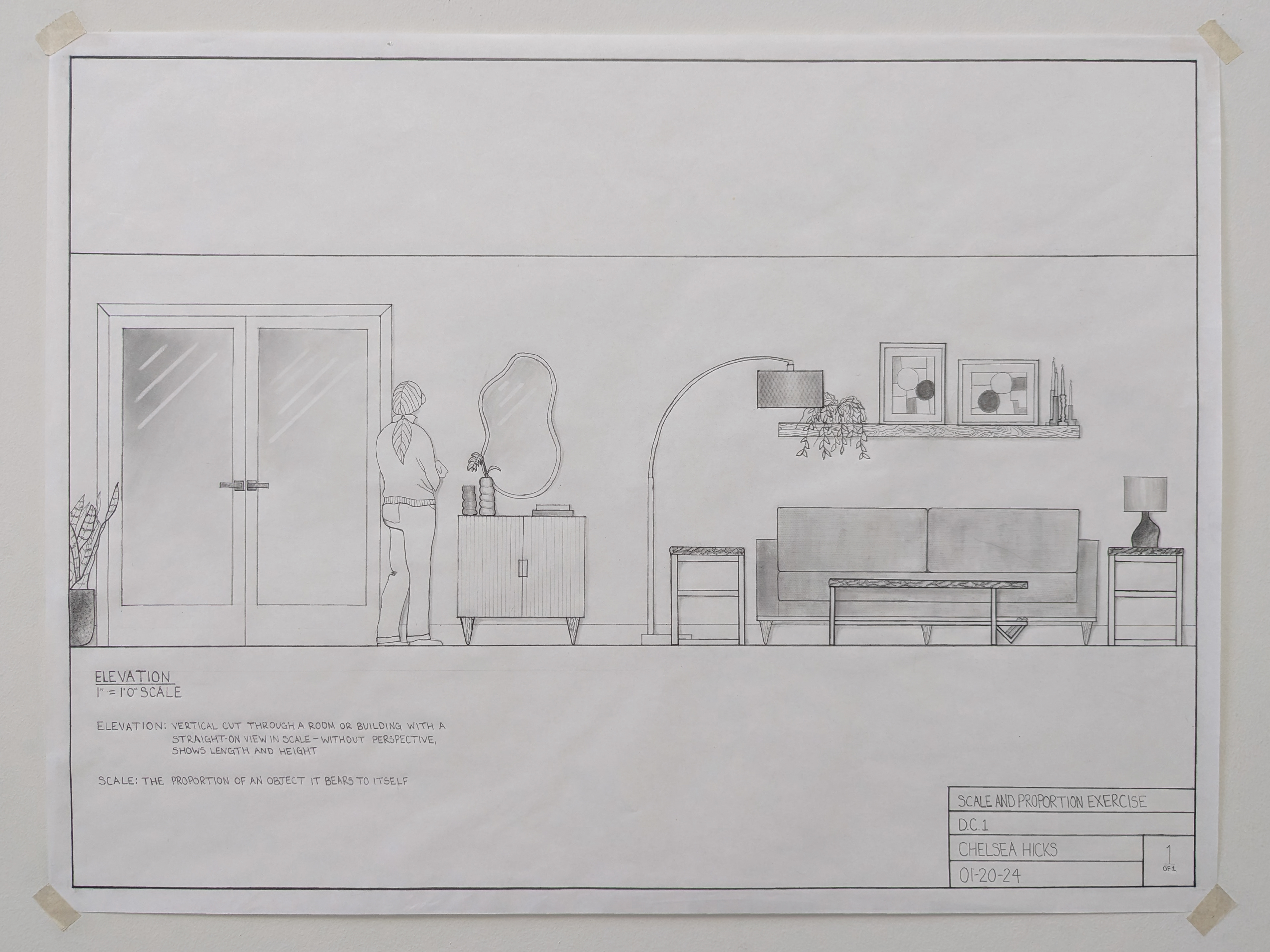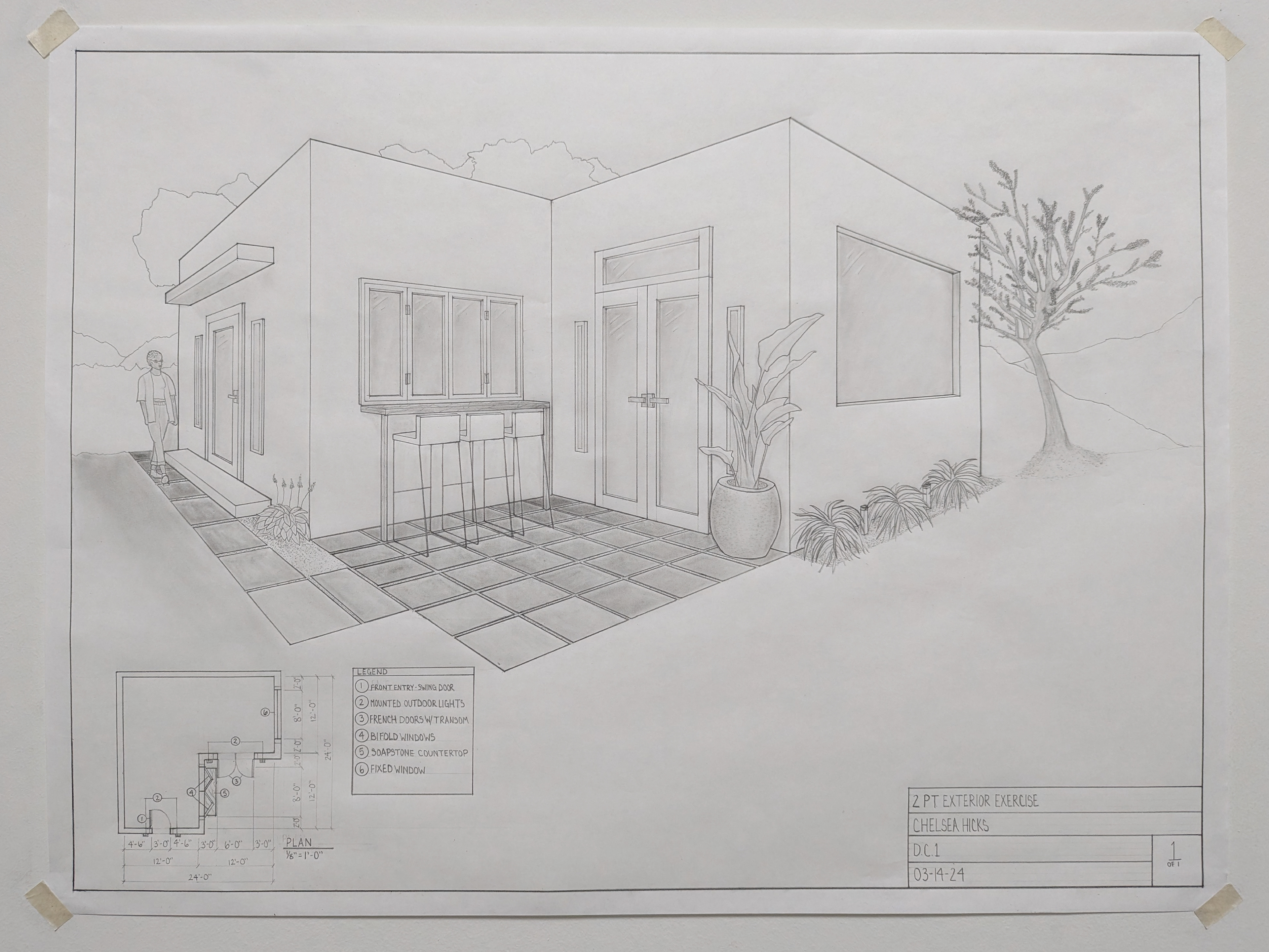 DC I was the first course in the program that taught hand drafting and drawing. The drawing are in black and white and are based on U.S. standard measurements. The exercises throughout the quarter introduced concepts such as composition, design, contour and line, proportion and scale, plan and section, perspective, form and space, as well as tone and shadows.