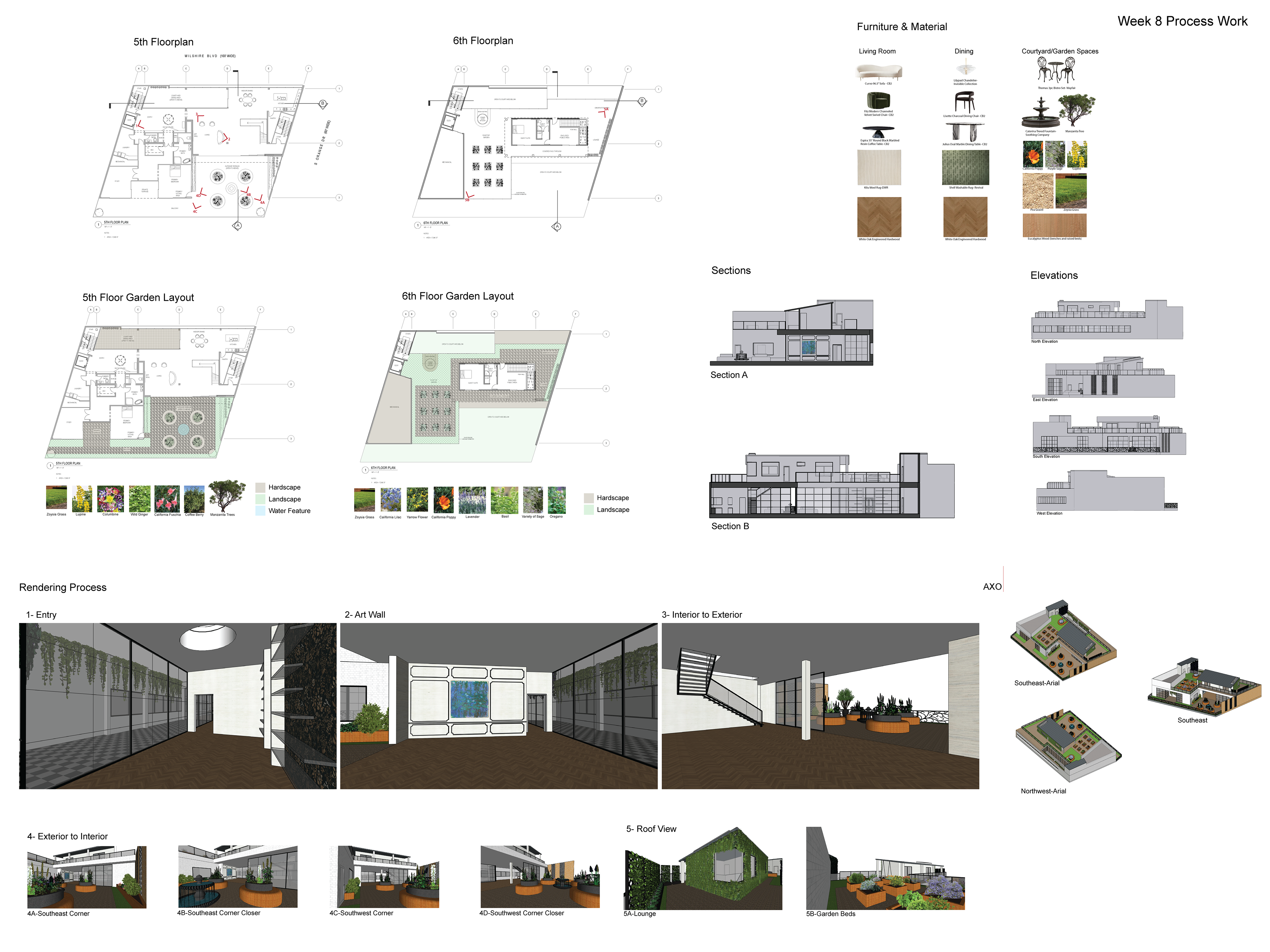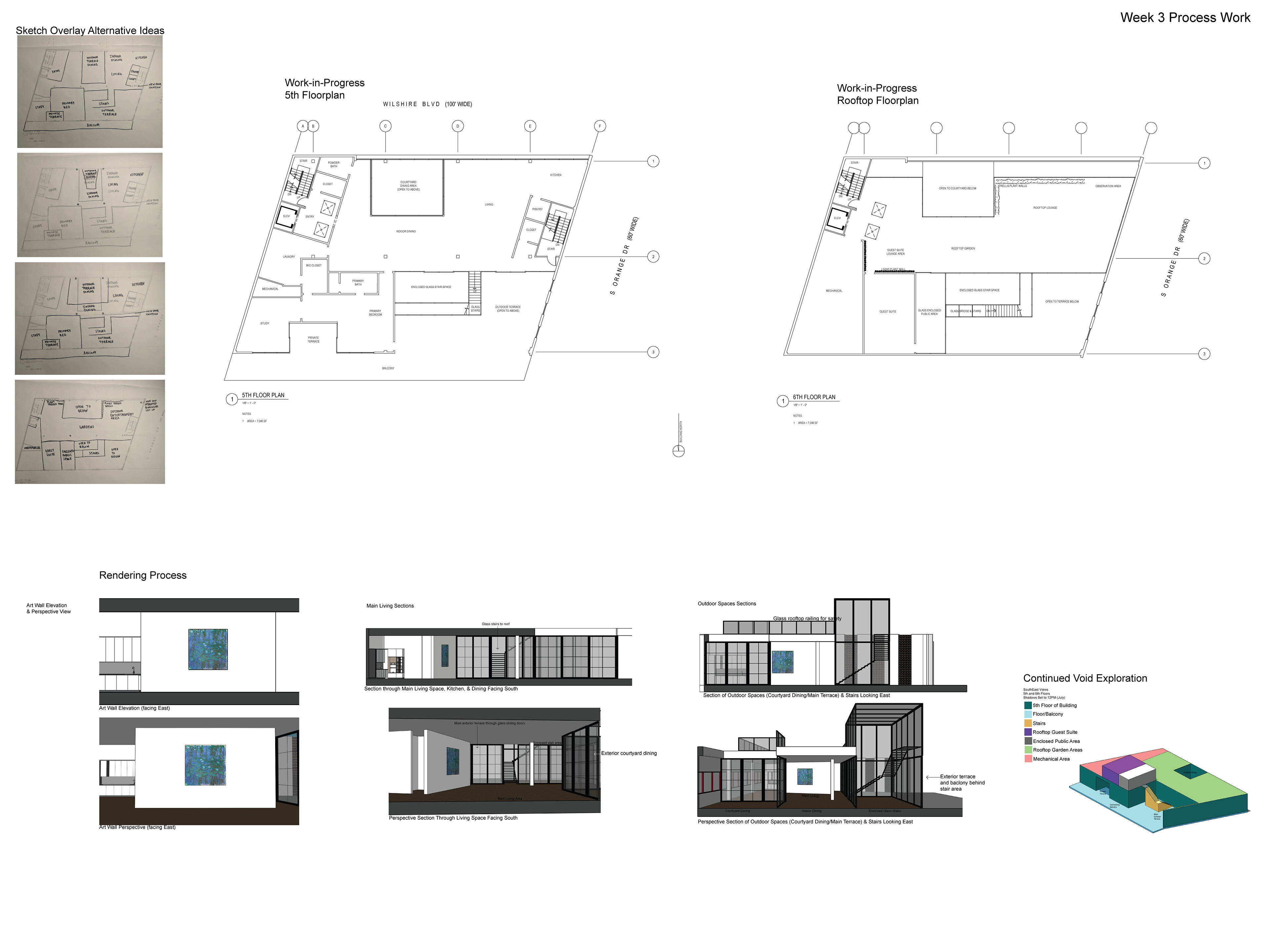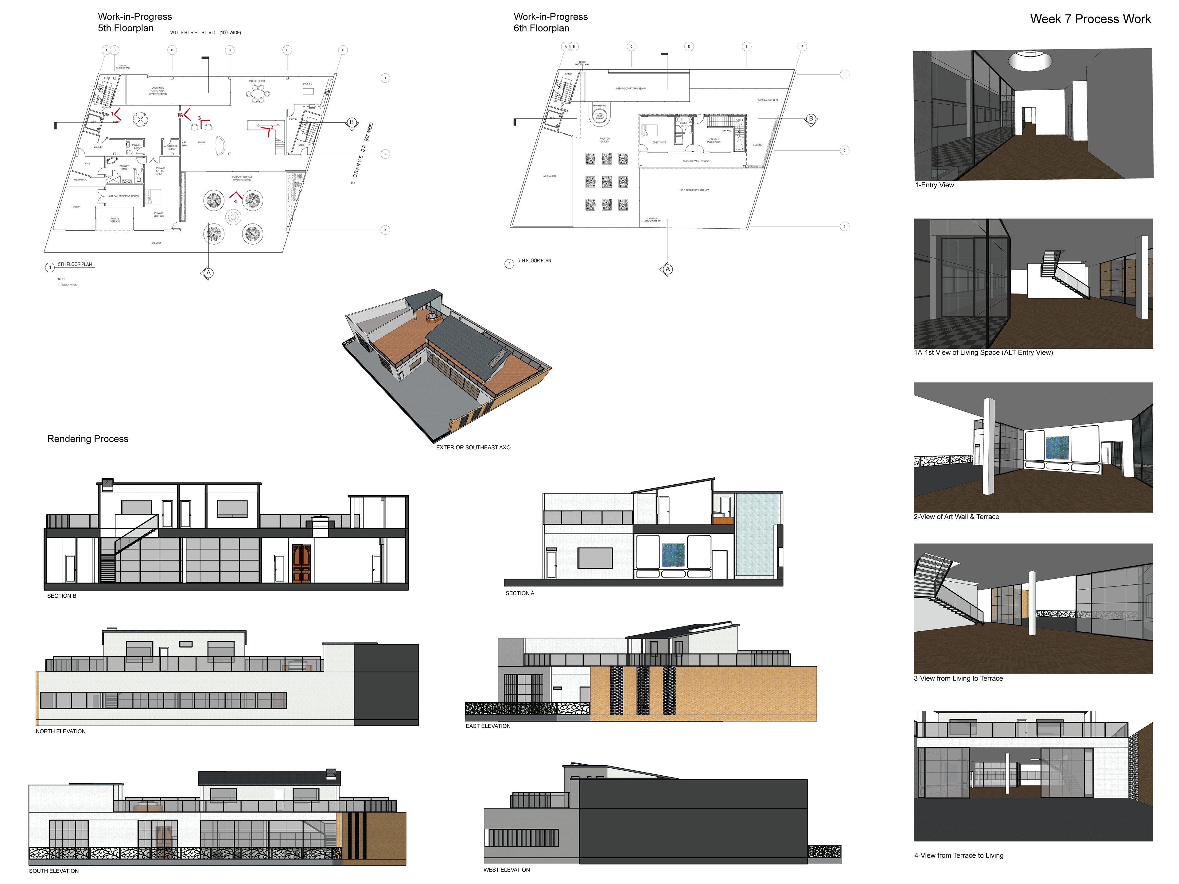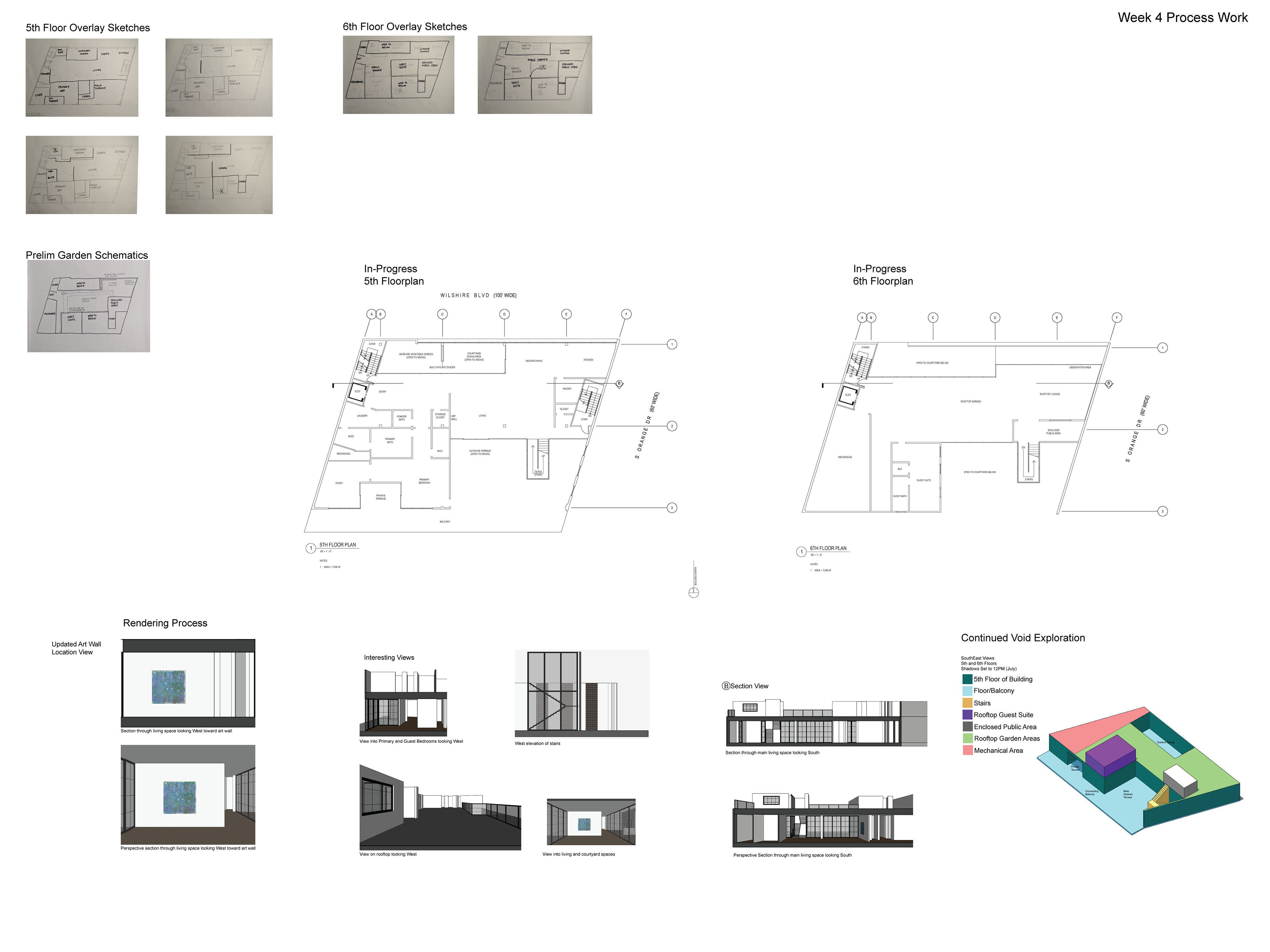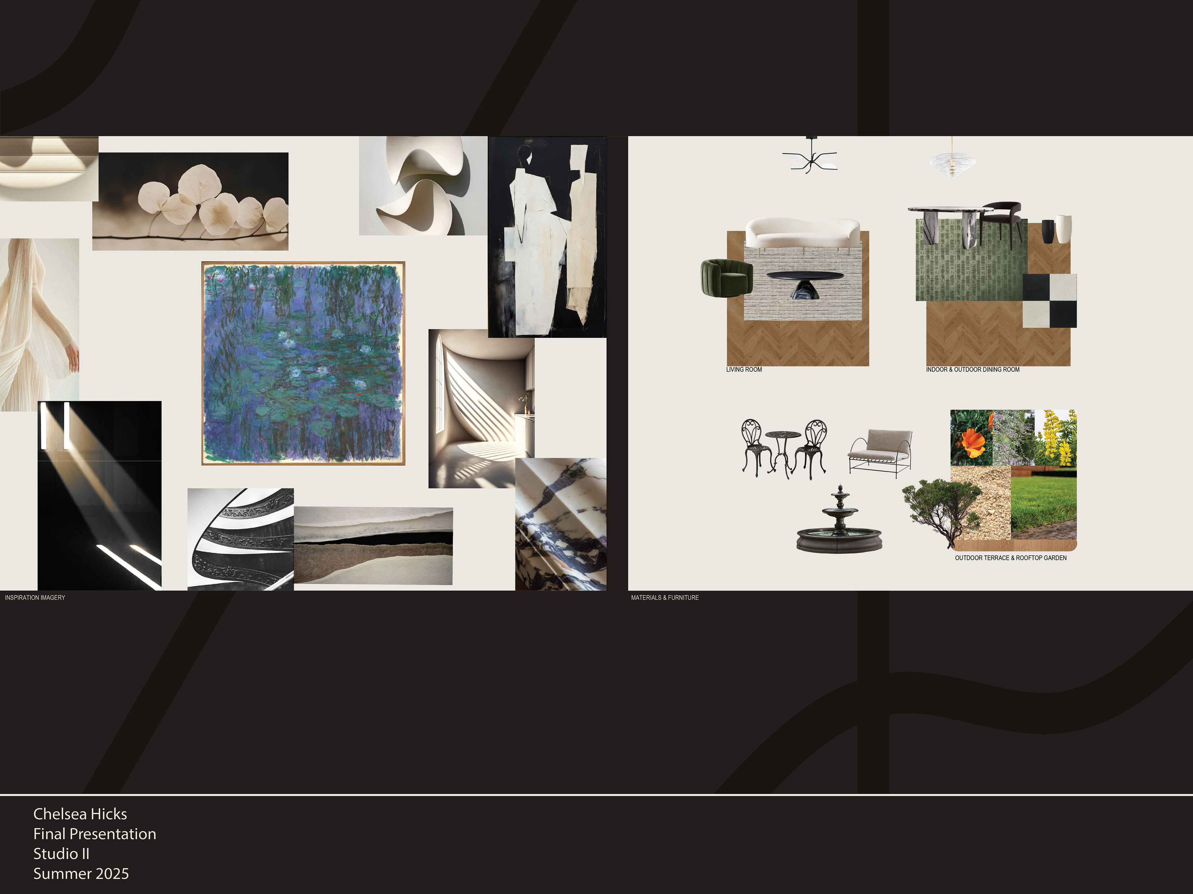 OBJECTIVE: Re-design the existing 5th floor and rooftop commercial spaces of the 5150 Wilshire Blvd building in Los Angeles to be a suitable residential space for Ms. Laurence des Cars, the director of The Louvre who will be temporarily residing here. The design must work around some historical elements of the building along with other parameters set forth by the professor. The design should be inspired by Ms. des Cars tastes as well as the Nymphéas Bleus painting by Claude Monet that she will be displaying in the residence. Another key feature should be the outdoor and rooftop garden spaces.