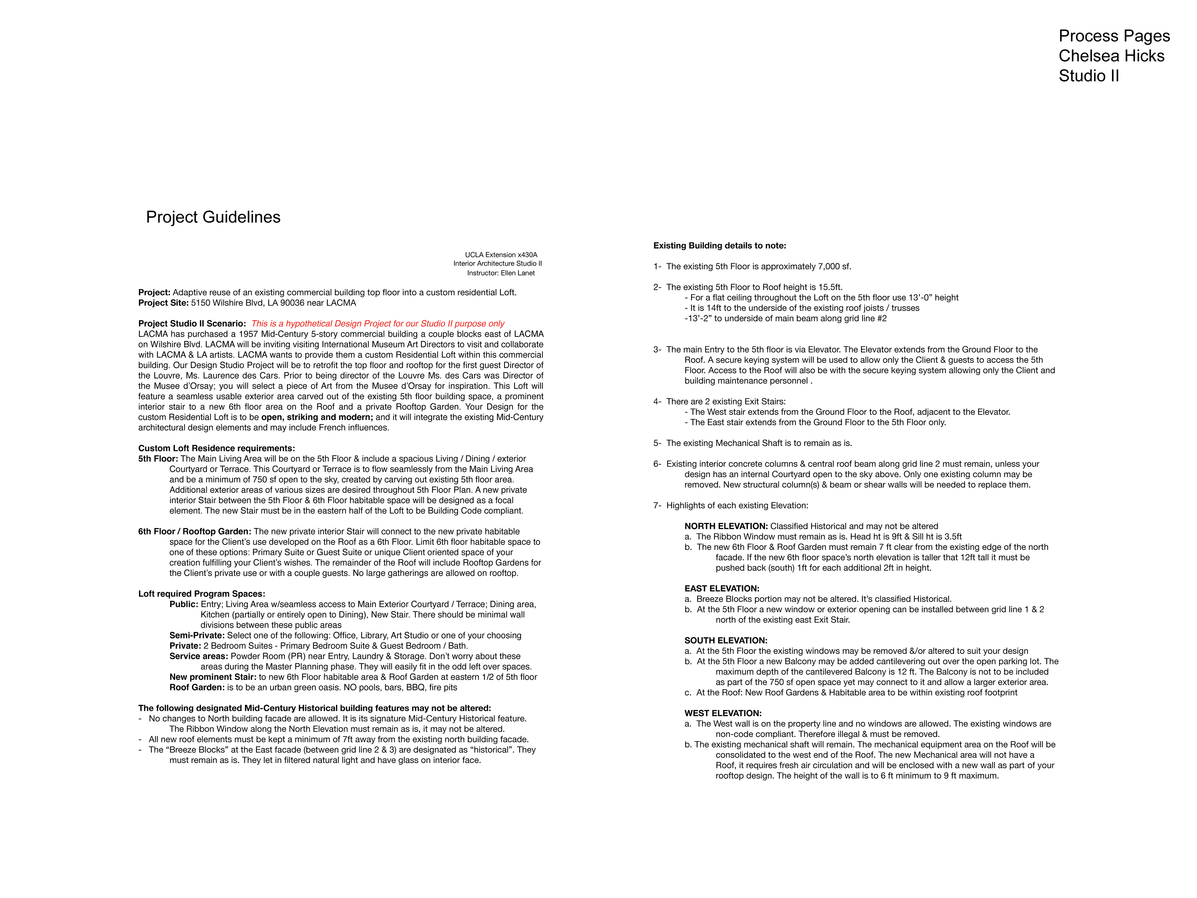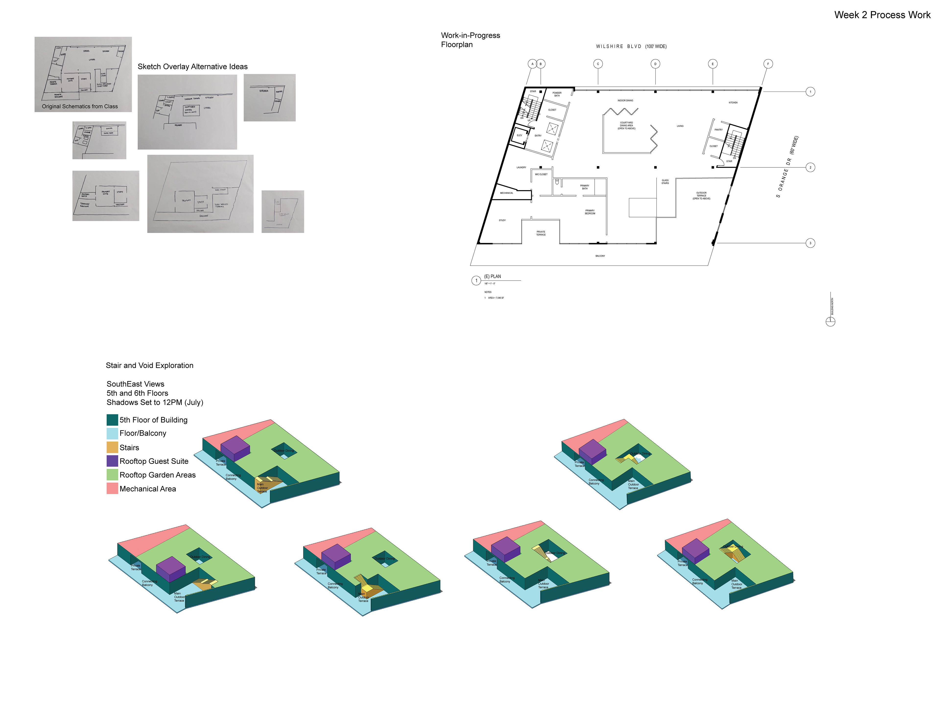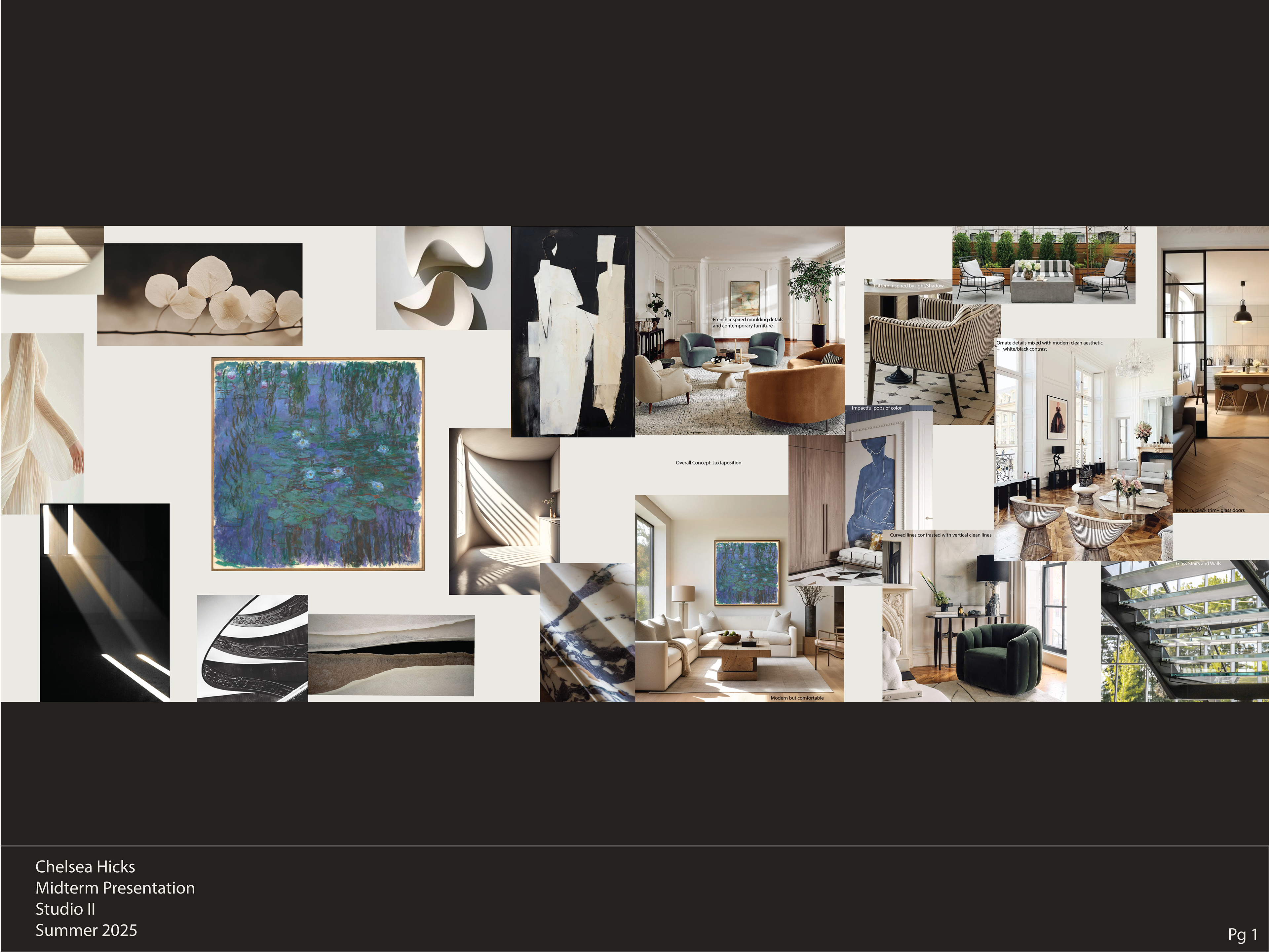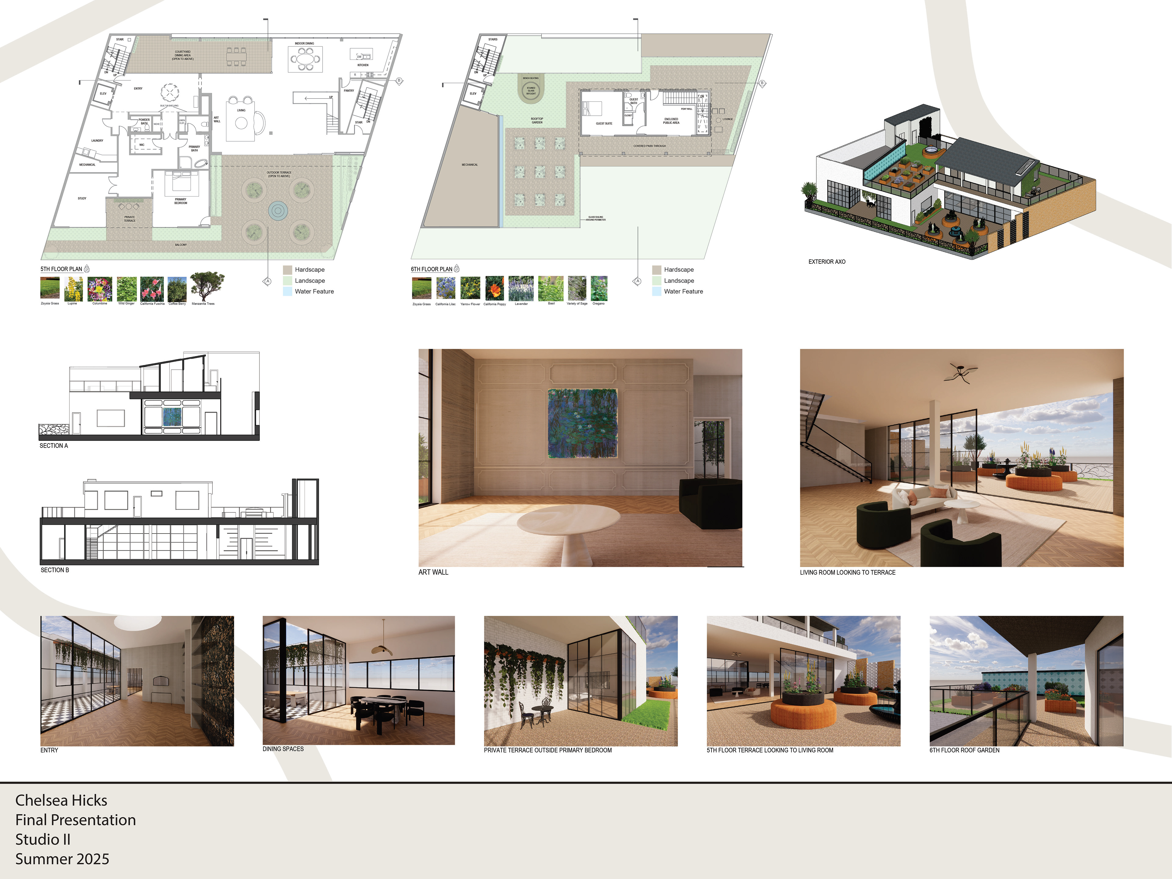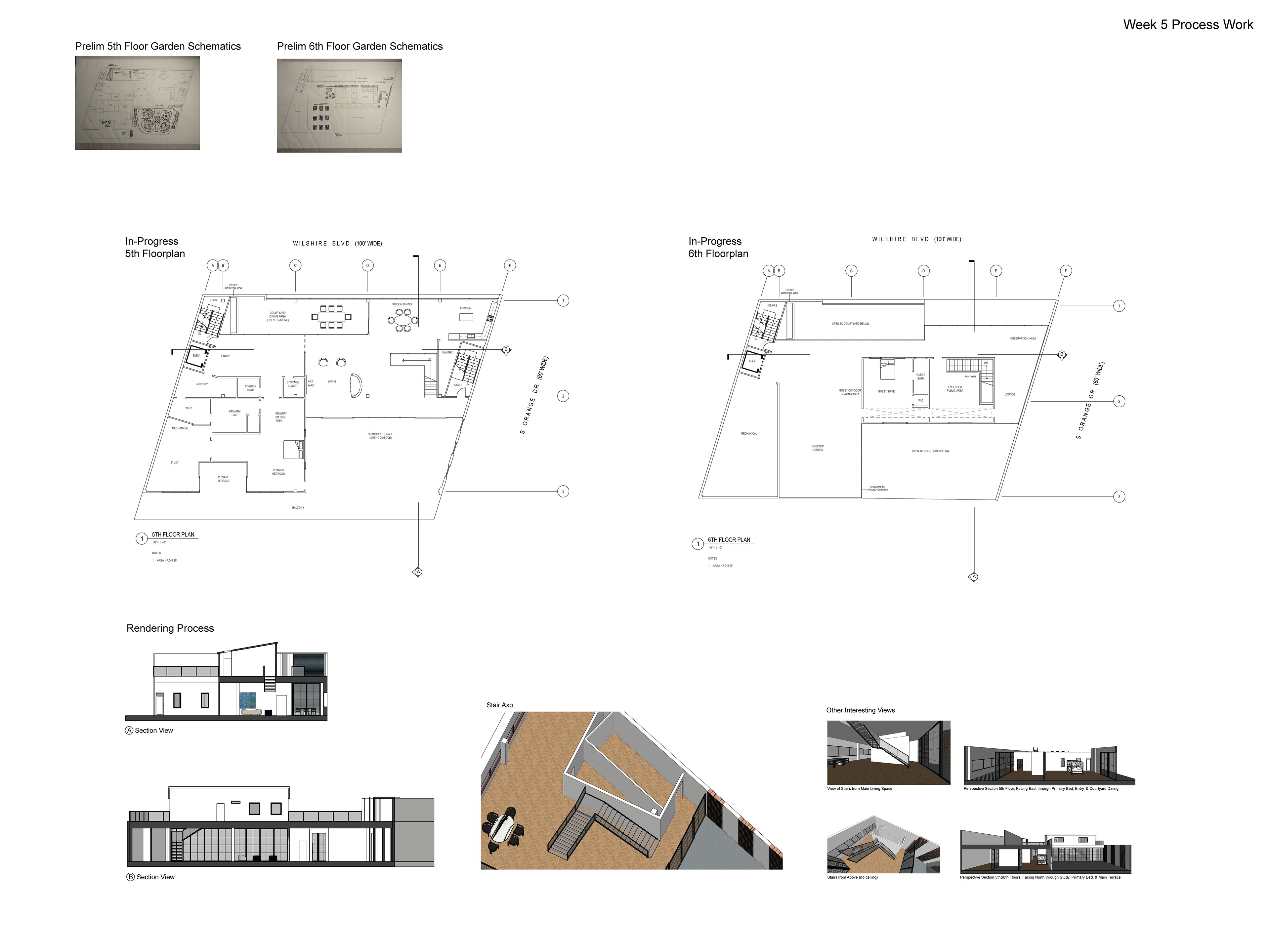 OBJECTIVE: Re-design the existing 5th floor and rooftop commercial spaces of the 5150 Wilshire Blvd building in Los Angeles to be a suitable residential space for Ms. Laurence des Cars, the director of The Louvre who will be temporarily residing here. The design must work around some historical elements of the building along with other parameters set forth by the professor. The design should be inspired by Ms. des Cars tastes as well as the Nymphéas Bleus painting by Claude Monet that she will be displaying in the residence. Another key feature should be the outdoor and rooftop garden spaces.