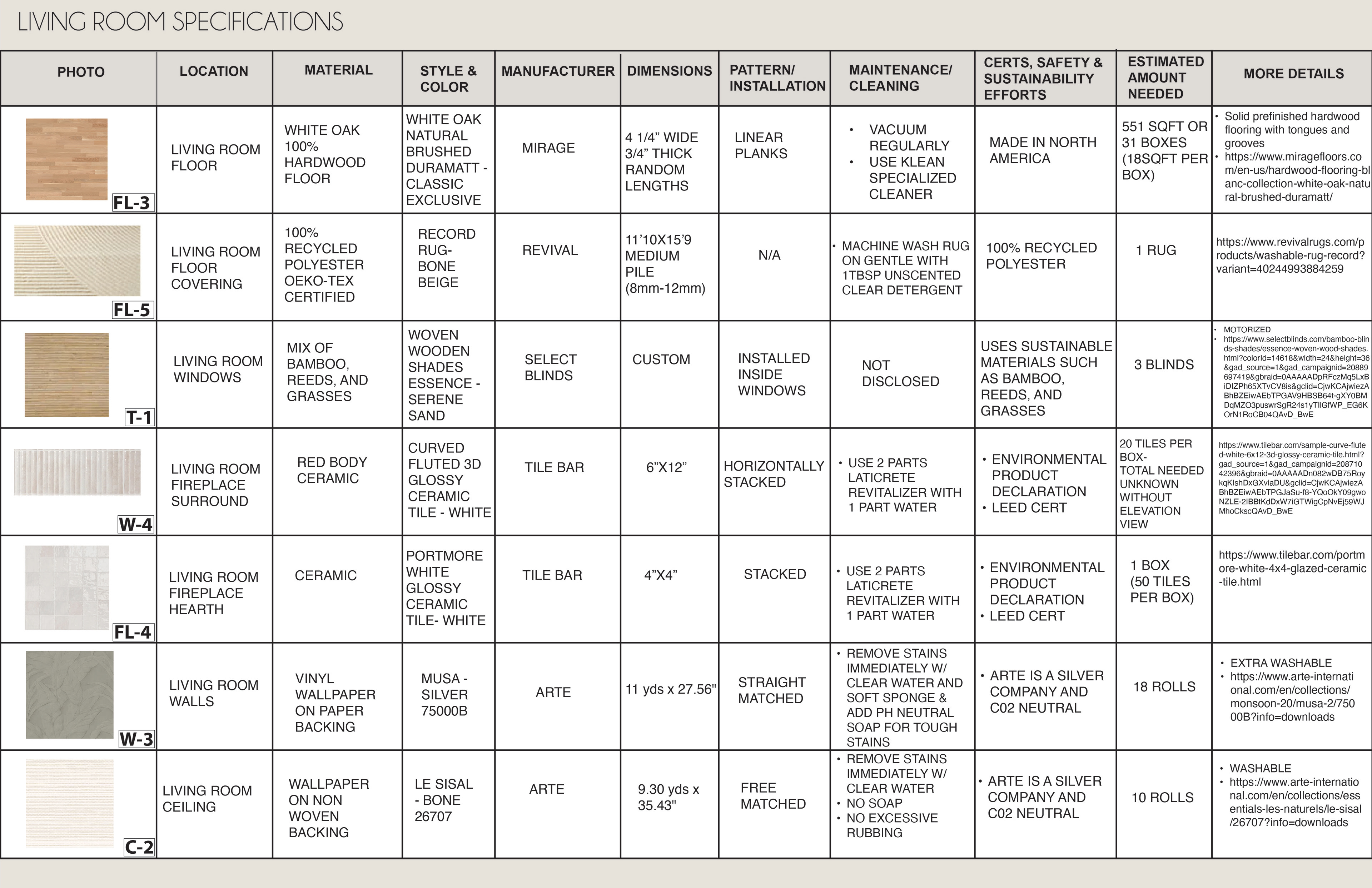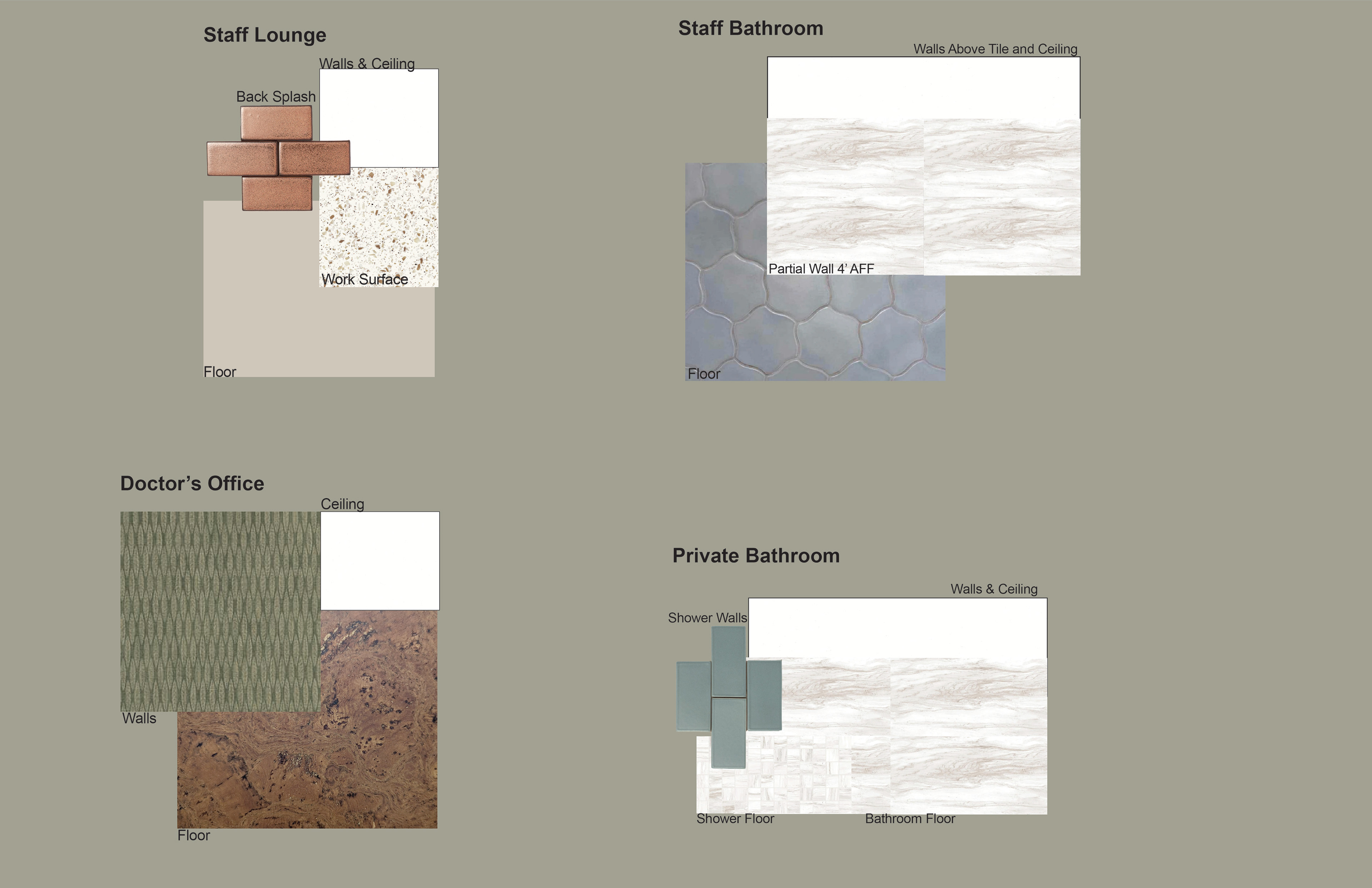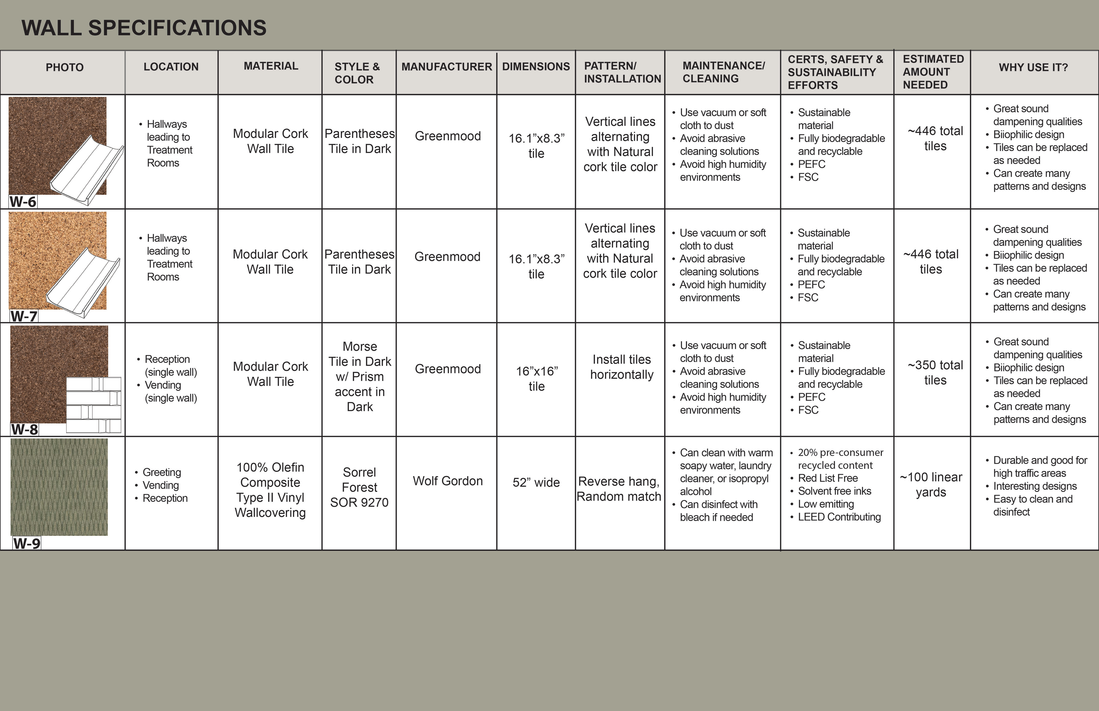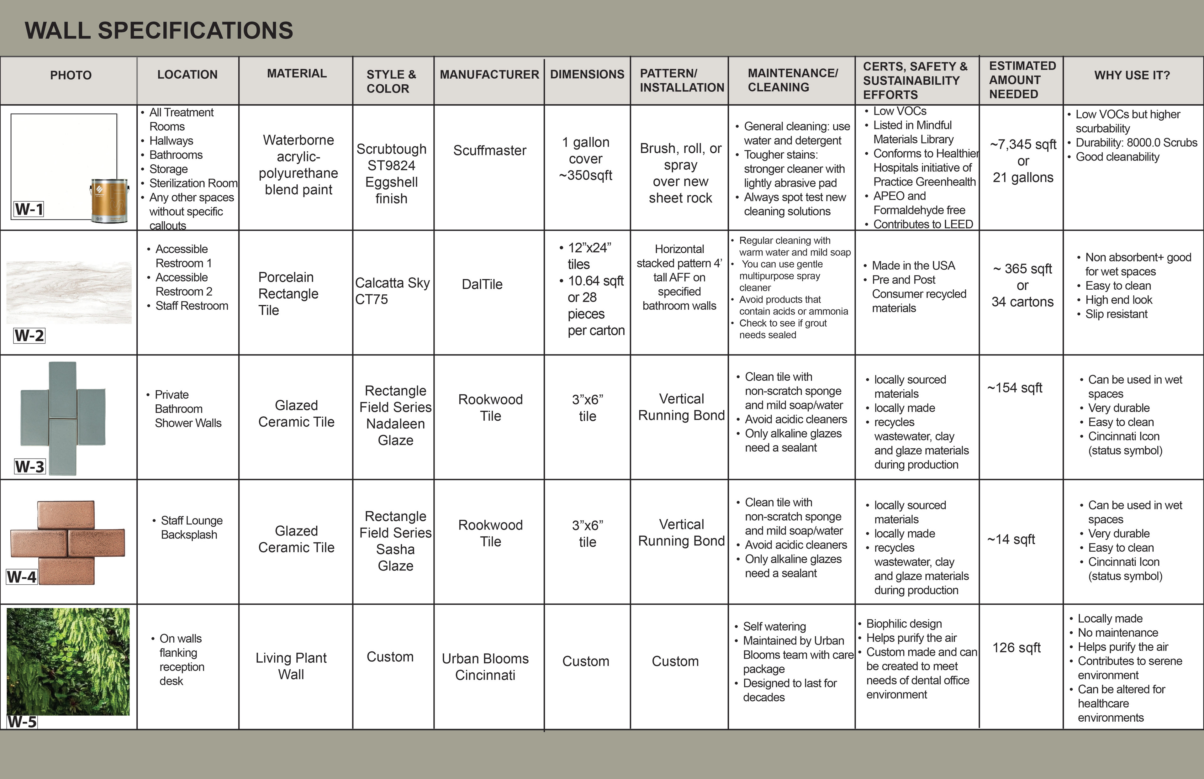 Surface Materials was a deep dive into selecting and speccing materials for both residential and commercial spaces throughout various projects during the quarter. For the sake of space and presentation, the attached spec sheets were left off but all documentation was turned in as part of the projects. There was an emphasis on exploration into sustainable and innovative materials for multiple projects.