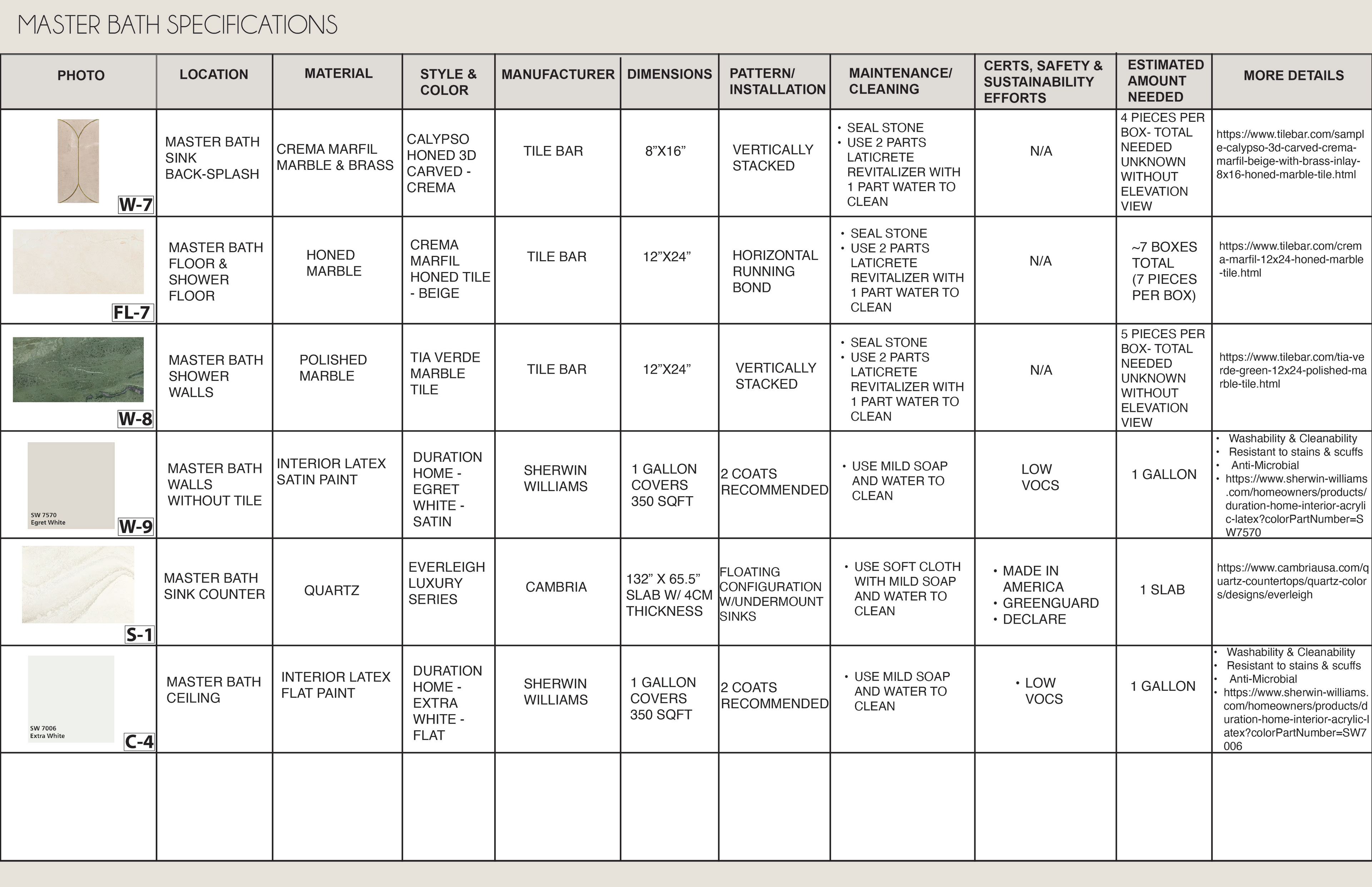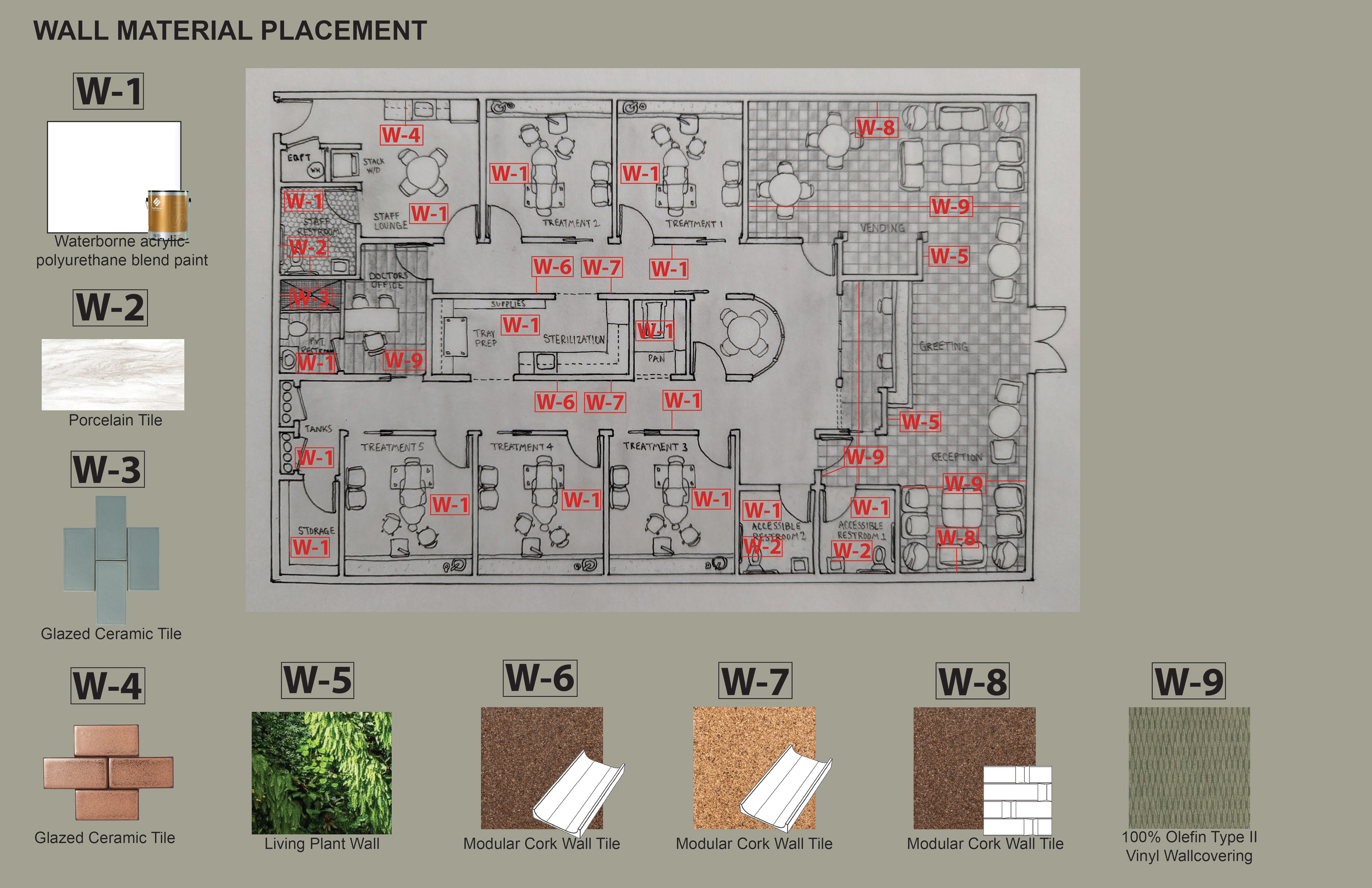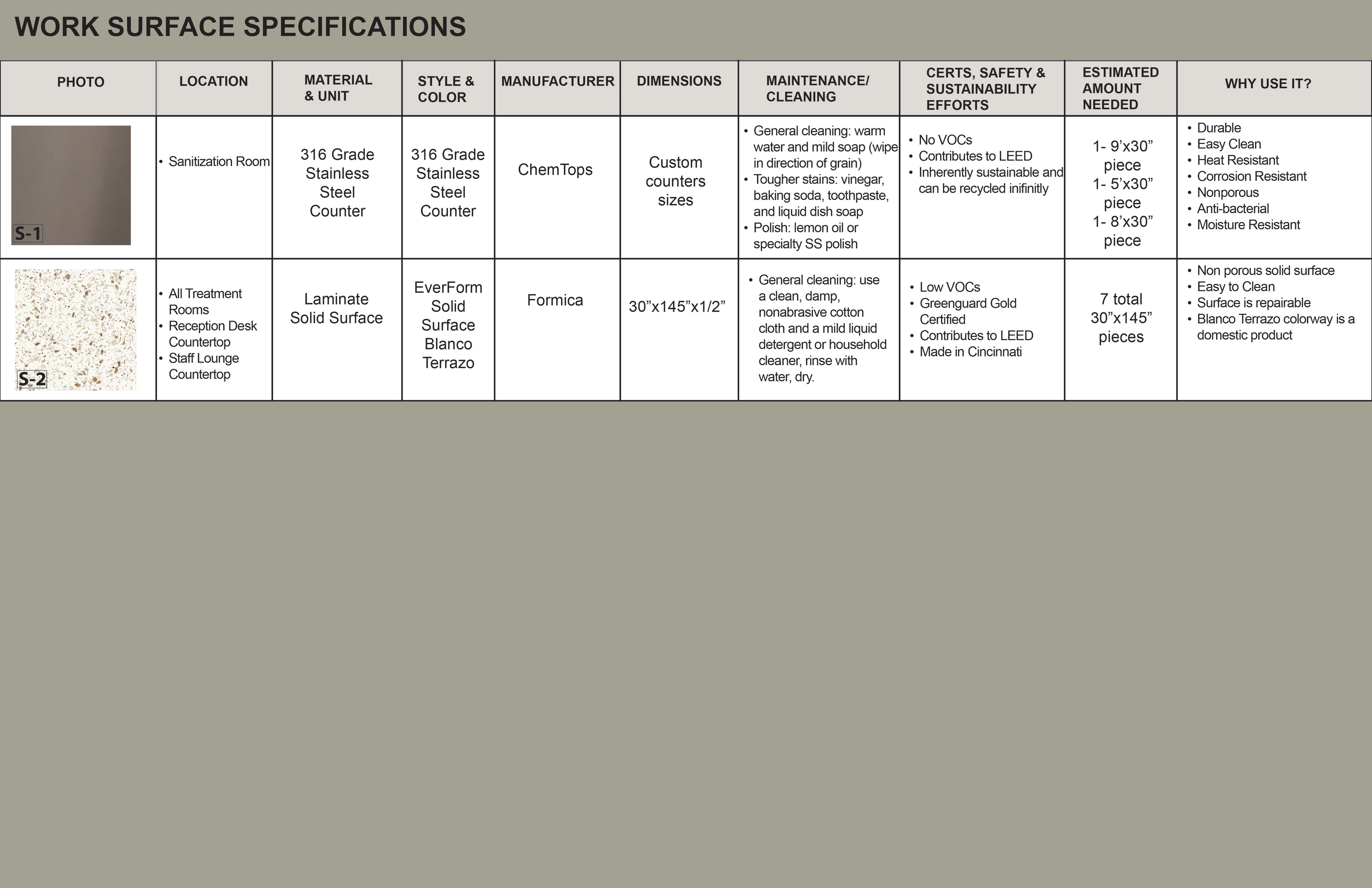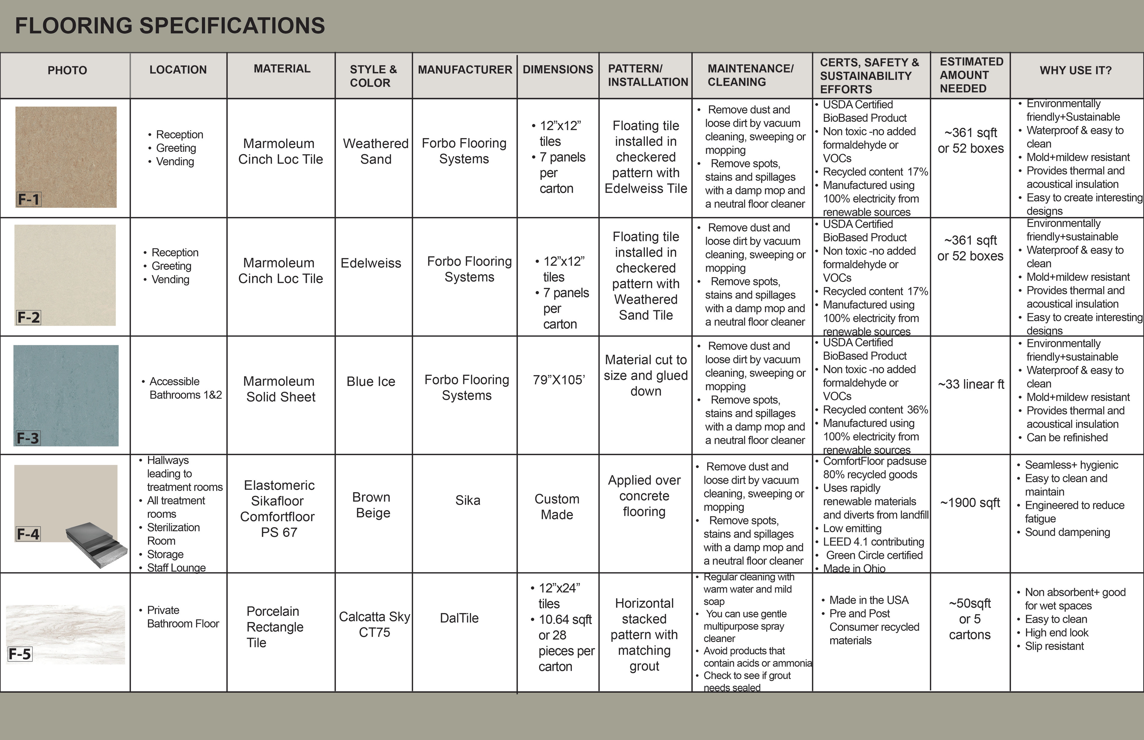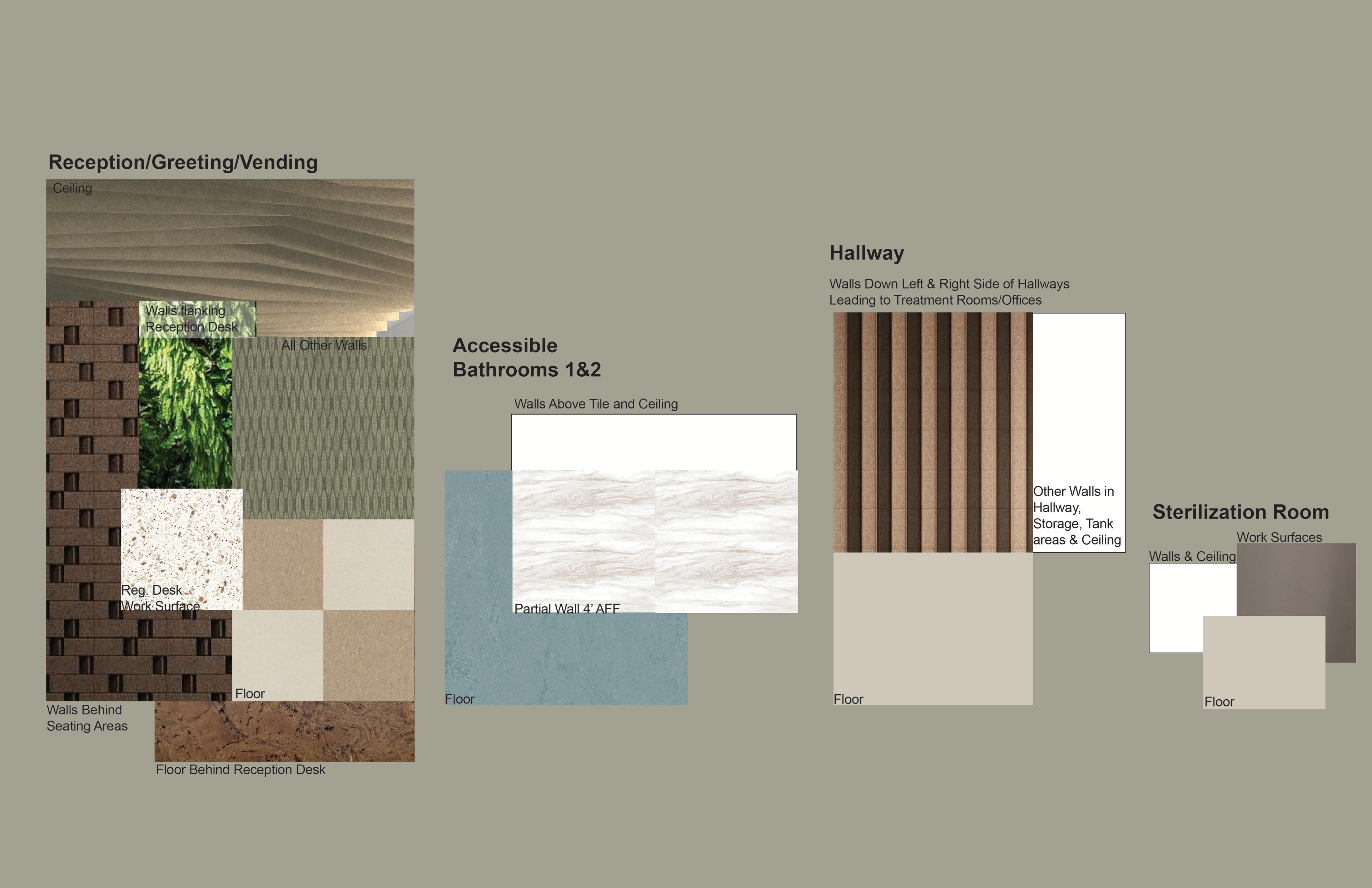 Surface Materials was a deep dive into selecting and speccing materials for both residential and commercial spaces throughout various projects during the quarter. For the sake of space and presentation, the attached spec sheets were left off but all documentation was turned in as part of the projects. There was an emphasis on exploration into sustainable and innovative materials for multiple projects.