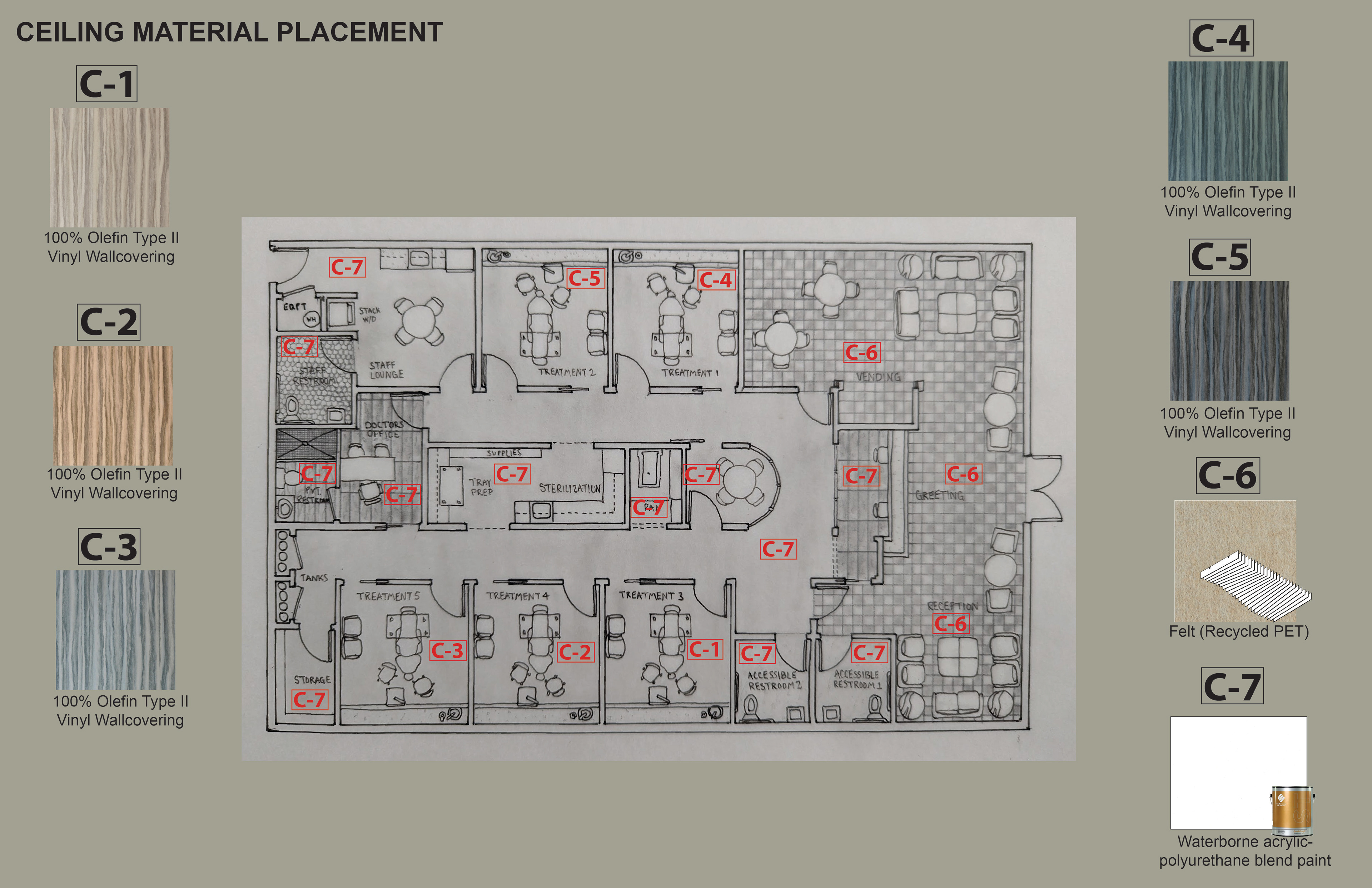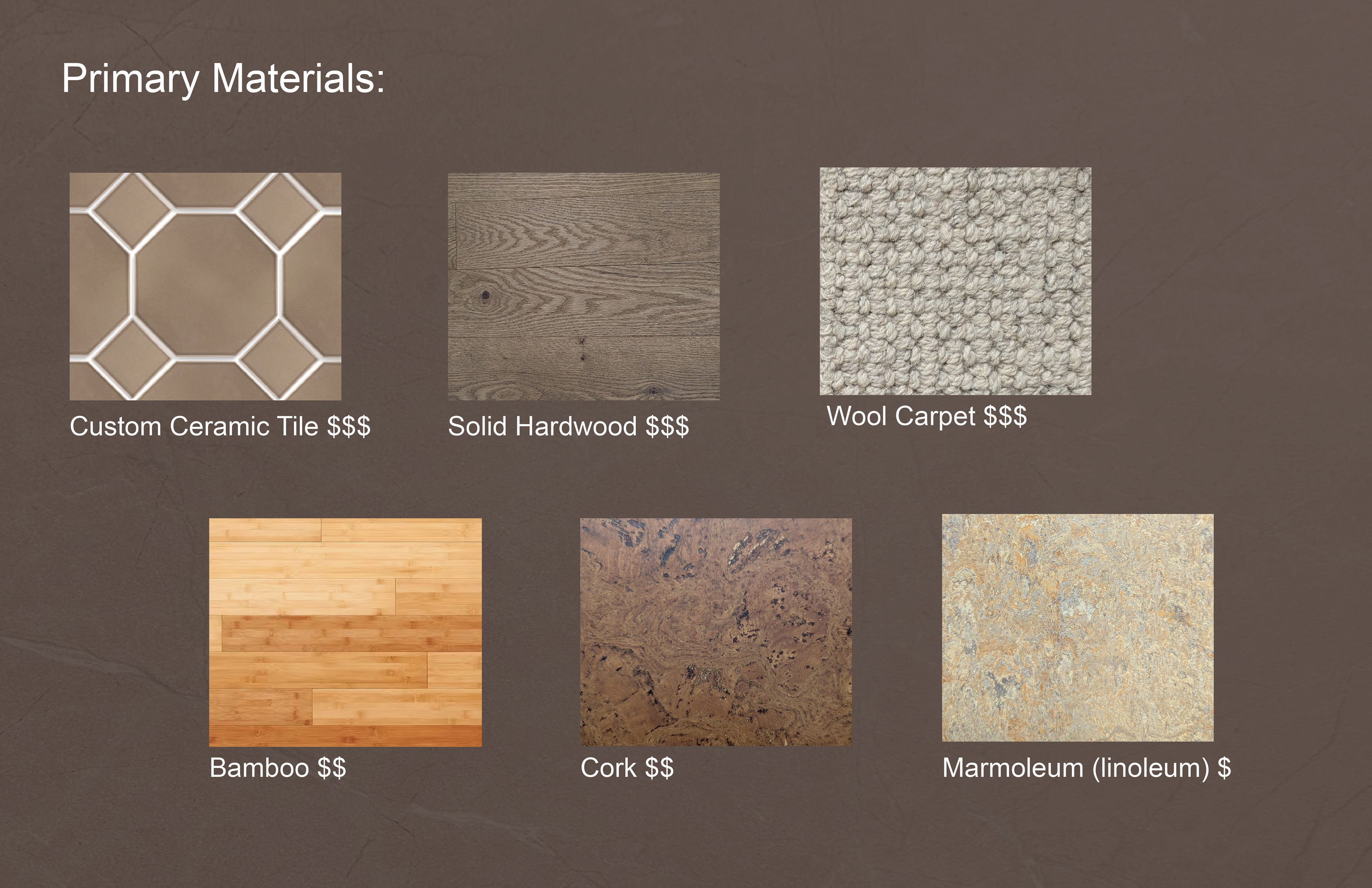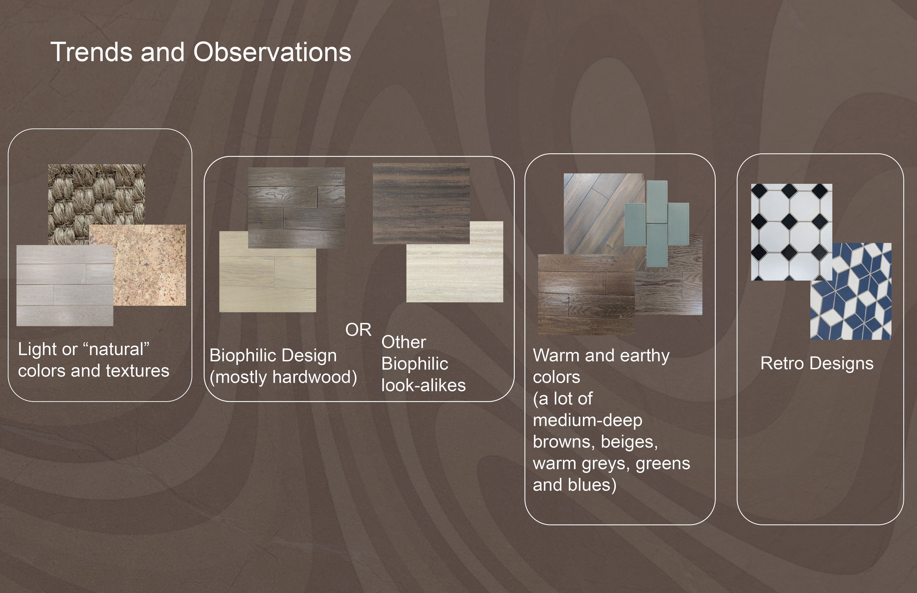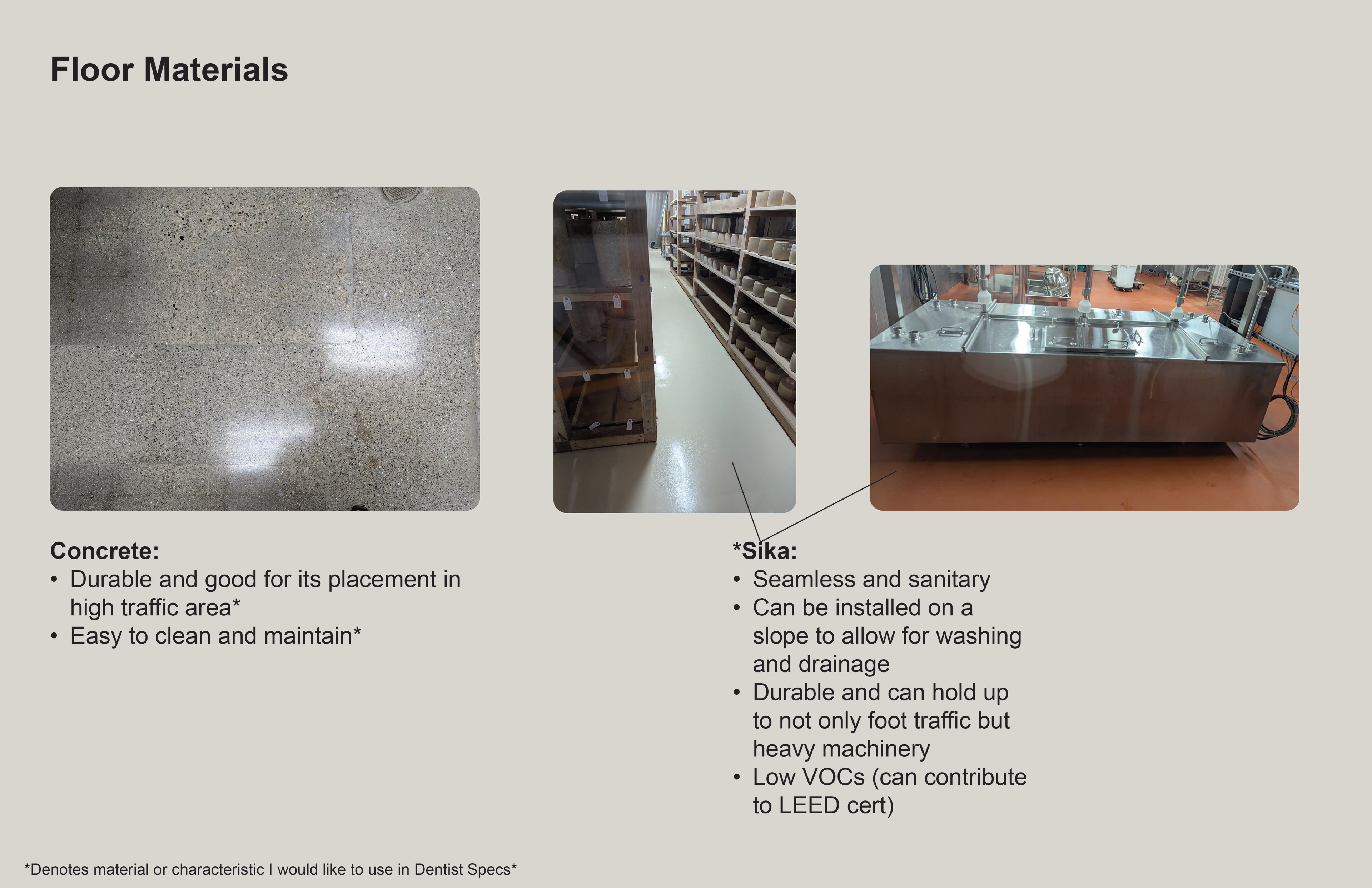 Surface Materials was a deep dive into selecting and speccing materials for both residential and commercial spaces throughout various projects during the quarter. For the sake of space and presentation, the attached spec sheets were left off but all documentation was turned in as part of the projects. There was an emphasis on exploration into sustainable and innovative materials for multiple projects.